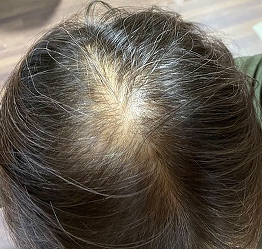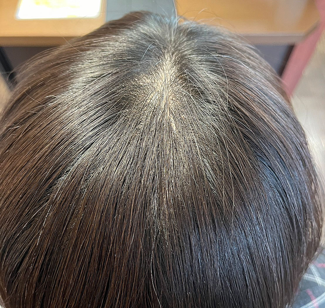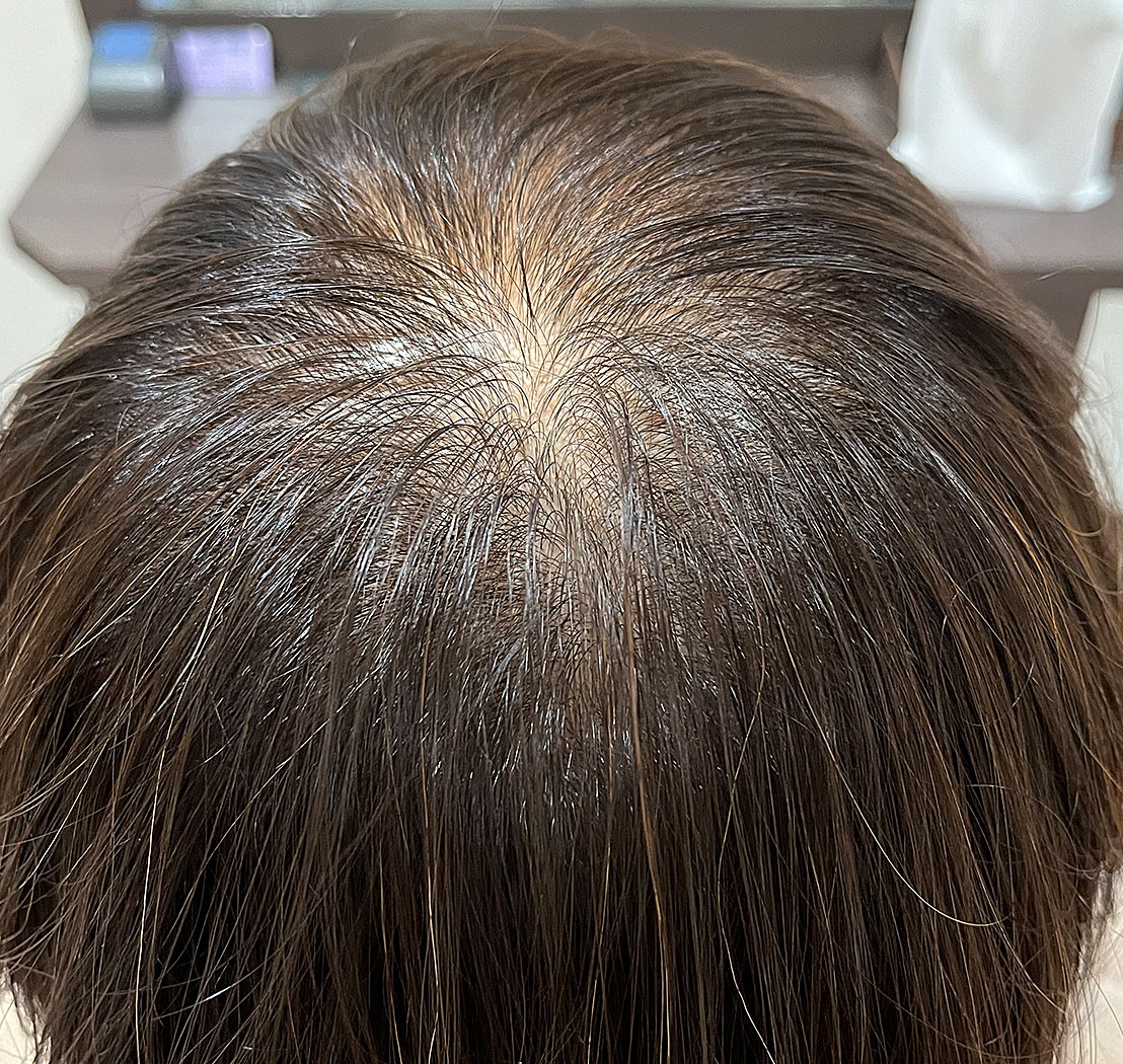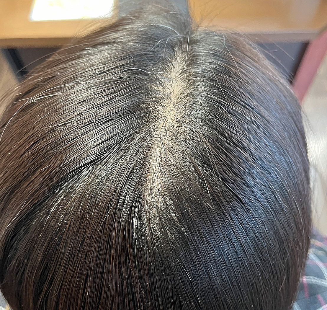 女性に多い脱毛症です。頭全体が均一に薄くなるため、脱毛している部分の境界がはっきりしません。